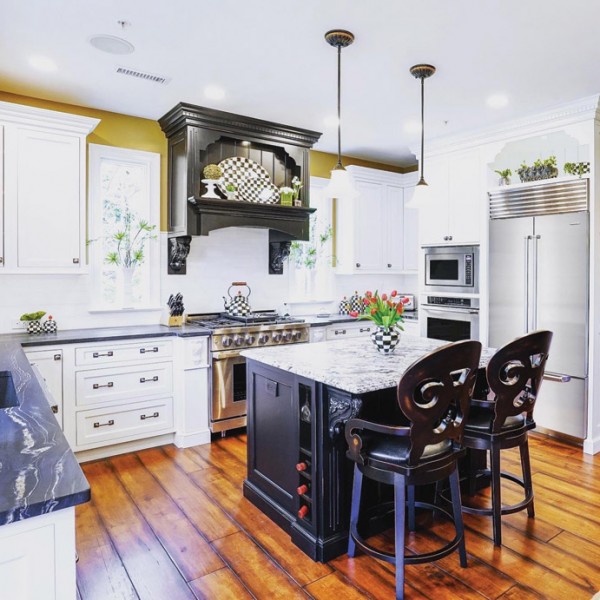A dramatic custom black hood with carved corbels anchors this kitchen, creating architectural presence against crisp white cabinetry and quartzite surfaces. The richly finished island serves as both a sculptural focal point and a gathering place, while warm golden walls envelop the room, amplifying natural light and introducing depth. Subtle checkerboard accents offer a refined nod to whimsy, thoughtfully layered rather than overt. Professional-grade appliances are seamlessly integrated, balancing performance with polish.