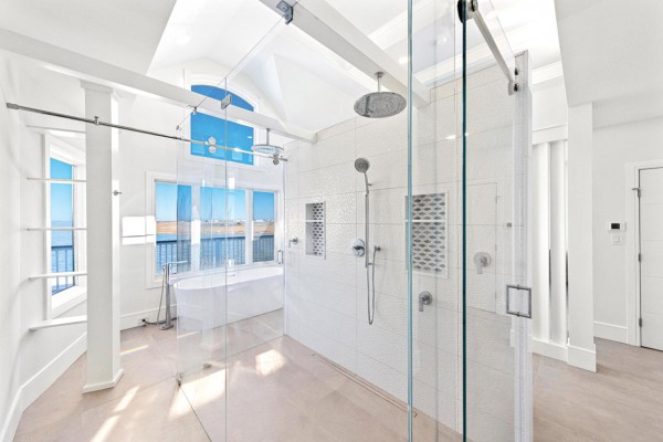 This master suite overlooks the bay in Long Beach Island with Andersen French doors providing access to the second floor deck. A radiant floor heating system provides warmth to the large format tile that runs continuously throughout the space. The curbless his and hers shower features top track sliding glass doors, two rain heads and a handheld shower head.