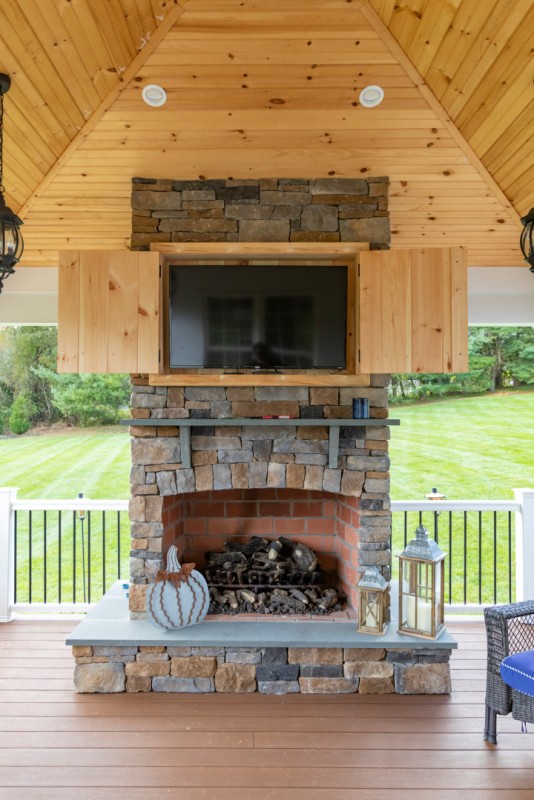“People are really into kitchens, but not just regular kitchens,” Glasner says. “We can do a barbecue-style grill, a smoker, a flat-top or a pizza oven. Other popular amenities include fireplaces, entertainment stands for TVs, roof structures and pergolas. We add infrared heaters, ceiling fans and we even have a system to put in aluminum frames with windows and screens to increase the length of time that you’re able to enjoy your outdoor living space.”